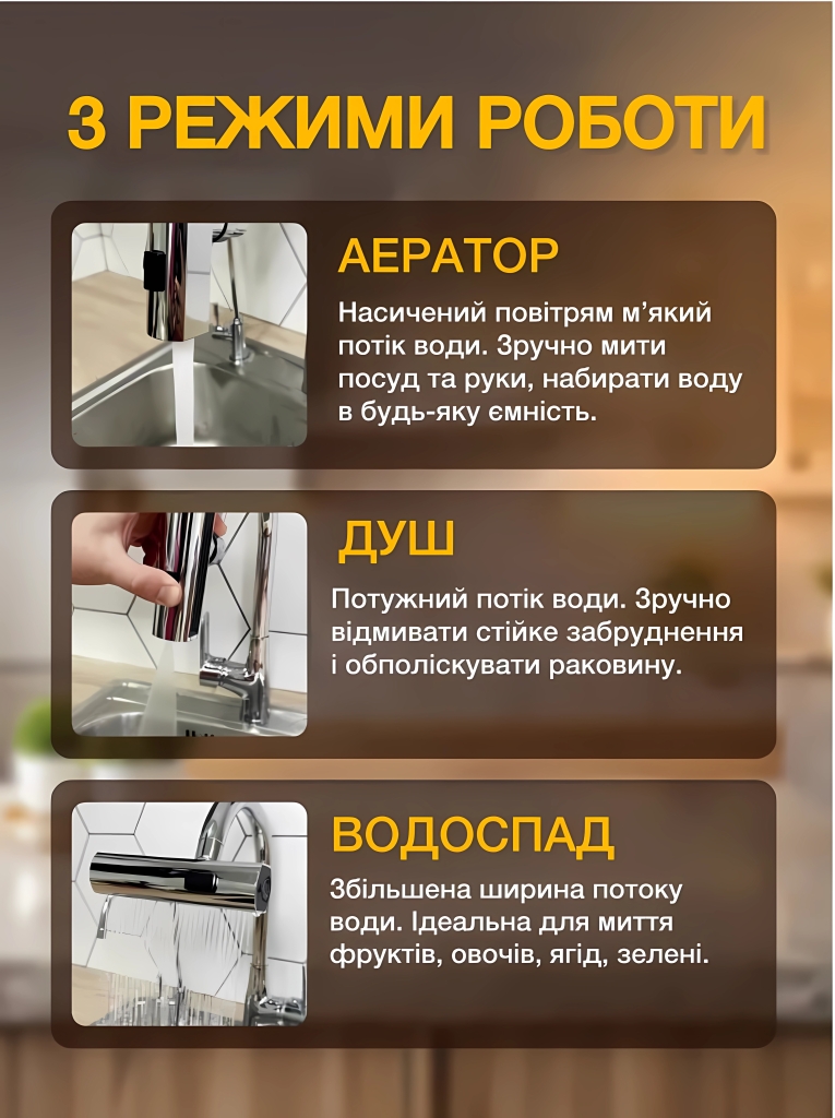 Купував жінці на кухню, дуже задоволена. Легко перемикаються режими, щодо економії води ще перевіряю. Хочу ще донці один купити. Продавця рекомендую.
