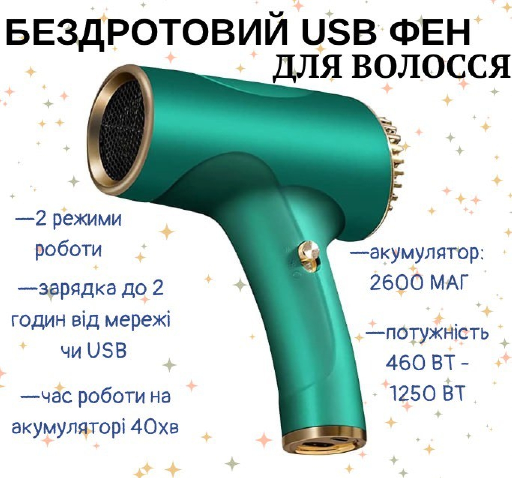 Бездротовий USB фен для волосся Portable hair Dryer 2600 mAh